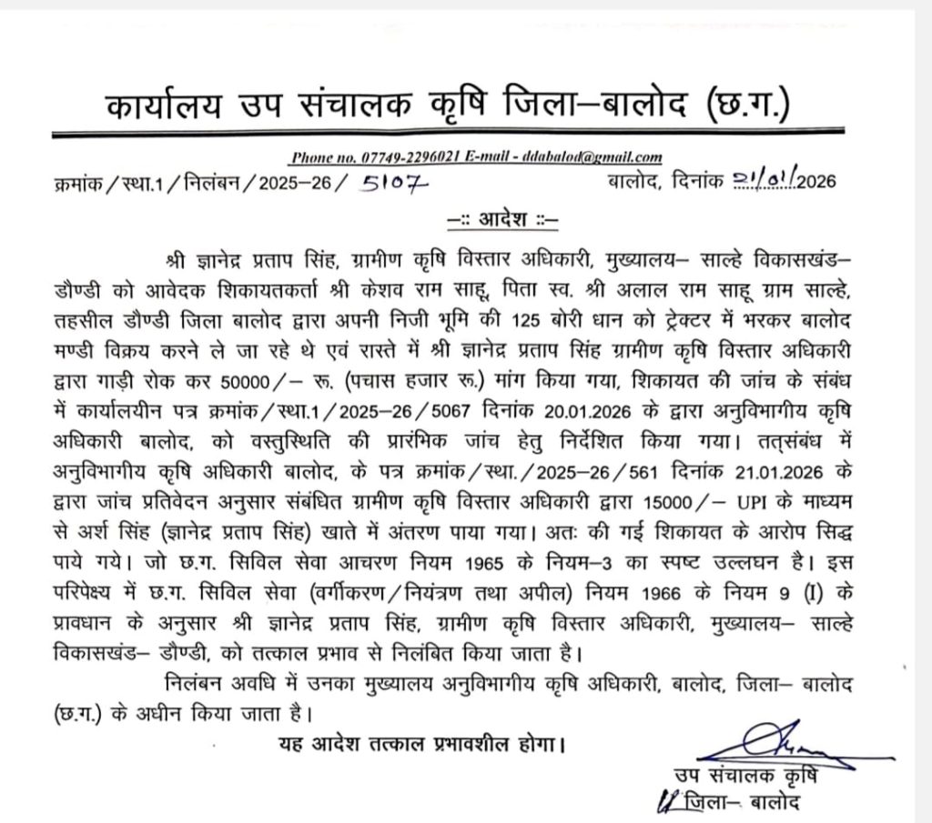 डौंडी विकासखंड के ग्राम साल्हे में पदस्थ ग्रामीण कृषि विस्तार अधिकारी ज्ञानेंद्र प्रताप सिंह पर भ्रष्टाचार के गंभीर आरोप लगे हैं. किसान केशव राम साहू अपनी निजी भूमि का 125 बोरी धान ट्रैक्टर में भरकर बालोद मंडी जा रहे थे. आरोप है कि रास्ते में अधिकारी ज्ञानेंद्र प्रताप ने गाड़ी रोकी और उसे छोड़ने के बदले 50 हजार रुपये की मांग की. शिकायत के बाद हुई प्रारंभिक जांच में चौंकाने वाला सच सामने आया. अधिकारी के खाते में UPI के जरिए 15 हजार रुपये ट्रांसफर किए जाने के सबूत मिले. सिविल सेवा आचरण नियम के उल्लंघन के चलते उप संचालक कृषि ने अधिकारी को तत्काल प्रभाव से निलंबित कर दिया है.