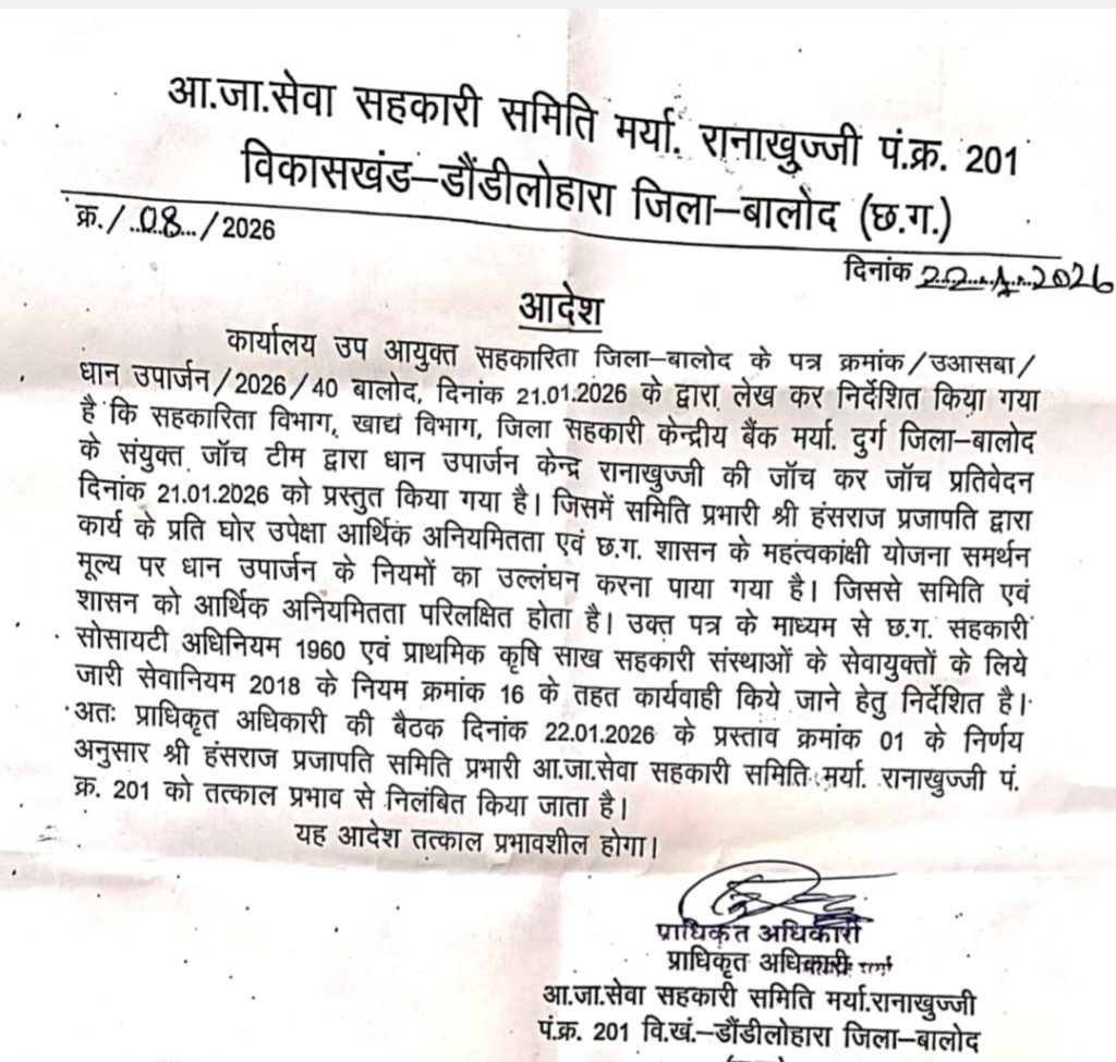 दूसरा मामला आदिम जाति सेवा सहकारी समिति रानाखुज्जी का है. यहाँ के समिति प्रभारी हंसराज प्रजापति पर आर्थिक अनियमितता और सरकारी नियमों की अनदेखी का आरोप है. सहकारिता, खाद्य विभाग और जिला सहकारी केंद्रीय बैंक की संयुक्त जांच टीम ने उपार्जन केंद्र में बड़ी खामियां पाईं. रिपोर्ट में स्पष्ट किया गया कि प्रभारी ने शासन की महत्वाकांक्षी धान खरीदी योजना के नियमों का उल्लंघन किया, जिससे सरकारी खजाने को आर्थिक क्षति पहुंचने की संभावना बनी. छत्तीसगढ़ सहकारी सोसायटी अधिनियम के तहत प्राधिकृत अधिकारी की बैठक में निर्णय लेते हुए हंसराज प्रजापति को सस्पेंड कर दिया गया है.