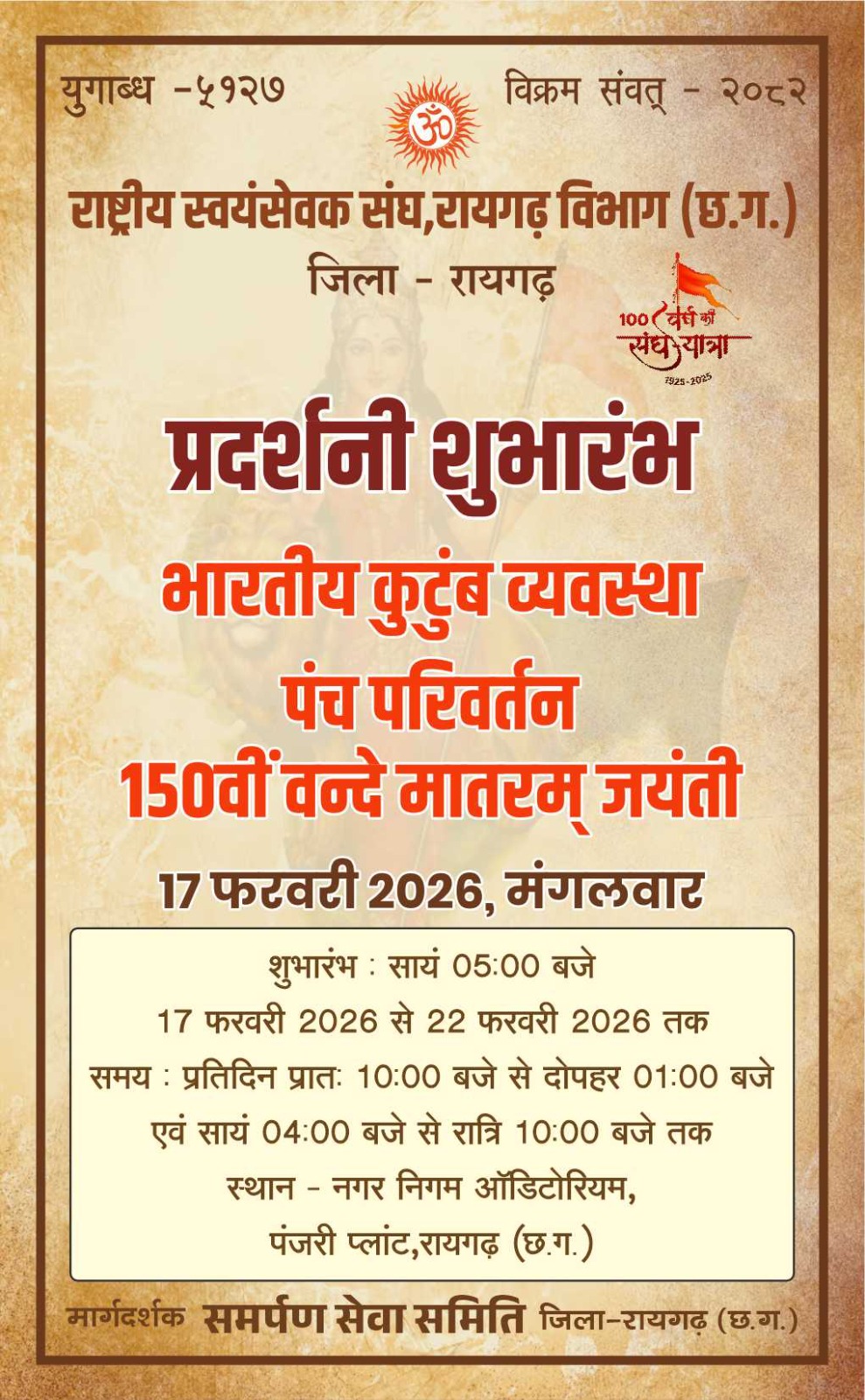 रायगढ़ (छत्तीसगढ़): समर्पण सेवा समिति रायगढ़ के मार्गदर्शन में आज, 17 फरवरी 2026 को नगर निगम ऑडिटोरियम, पंजरी प्लांट में एक विशेष प्रदर्शनी का शुभारंभ किया गया है। यह प्रदर्शनी संघ की 100 वर्षों की यात्रा में पड़ाव रूपी पंचपरिवर्तन,भारतीय कुटुंब व्यवस्था एवं वंदे मातरम् की 150वीं जयंती के गौरवशाली अवसर पर प्रदर्शित की जा रही है।