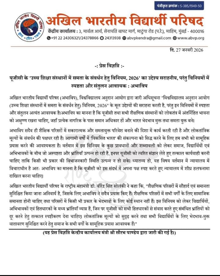 विश्वविद्यालय अनुदान आयोग द्वारा जारी अधिसूचना “विश्वविद्यालय अनुदान आयोग (उच्च शिक्षा संस्थानों में समता के संवर्धन हेतु) विनियम, 2026” का उद्देश्य महत्वपूर्ण है, परंतु इन विनियमों में स्पष्टता और संतुलन अत्यंत आवश्यक है।अभाविप मानती है कि यूजीसी तथा सभी शैक्षणिक संस्थानों को लोकतंत्र में अंतर्निहित भावना को अक्षुण्ण रखना चाहिए, जहाँ प्रत्येक नागरिक के पास समान अधिकार हों और भारत भेदभाव मुक्त तथा समता युक्त बने।